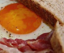5. 2 Eier und 4 scheiben Bacon in etwas Öl oder Butter anbraten und zum Toast dazu essen.