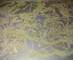 Ist die erste ausgerollte Scheibe etwas angetrocknet kann sie in Streifen geschnitten werden. Dazu rollen Sie die Scheibe zu einer lockeren Rolle zusammen und dann wie eine Gurke in 5-7mm dicke Scheiben schneiden (Achtung!!! beim schneiden die Hand über den Teig gleiten lassen, da es sonst verkleben kann), anschließend leicht mit Mehl bestäuben und auflockern.