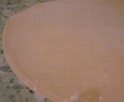 Die Arbeitsfläche mit Mehl bestäuben und mit dem Nudelholz denn Nudelteig ausrollen!!! Siehe Bild