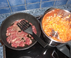 "Mixtopf geschlossen" geben und bei Stufe 5 / 3 Sek fein hacken. (Sichtkontakt)Hackfleisch im Öl in der Pfanne scharf anbraten und die Gemüsezwiebelmischung aus dem
