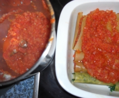 "Mixtopf geschlossen" geben und auf Stufe 5 / 3 Sek hacken. Anschließend Öl in den Mixer geben und Varoma / Stufe 1 / 5 Min die Zwiebeln andünsten. Dann die Tomaten, Tomatenmark, Gewürze und die Kräuter dazugeben und 100° / Stufe 1 / 5 Min weiter köcheln lassen. Die Tomatensoße über die Cannelloni geben