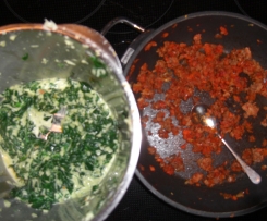 "Mixtopf geschlossen" geben und bei Stufe 5 / 3 Sek unter Sichtkontakt fein hacken. Das Öl in den Mixer dazugeben und Varoma/ Stufe 1/ 2, 5 Min dünsten. Anschließend den Spinat dazugeben und nochmals 2,5 Min/ 100°/ Stufe 1 weiterdünsten.Nachdem dünsten, den Bergkäse und die Gewürze zu den Spinat geben und auf Stufe 5 / 3- 4 Sek hacken. Die Masse etwas auskühlen lassen.