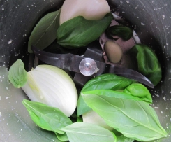 - Die Zwiebel, den Knoblauch und Basilikum in den