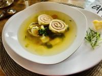 Die fertigen Brätstrudel in Streifen schneiden und in heißer Suppenbrühe nur kurz ziehen lassen. Ich bevorzuge immer eine selbst gemachte Rinderbrühe.
