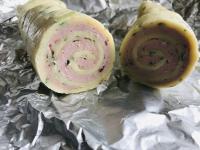 - 1. Das Leberkäse Brät gleichmäßig, nicht zu dick, auf die ausgekühlten Pfannkuchen streichen und aufrollen.
