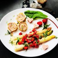 Es gab die Strudel einmal als Beilage zu gebratenen Spargel , Kräutern und Erdbeeren.