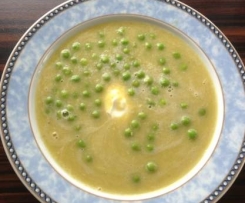"Mixtopf geschlossen" 6 Sek./Stufe 6 zerkleinern und mit dem Spatel nach unten schieben. Öl zugeben und 2 Min./Varoma/Stufe 1 anschwitzen. Erbsen, Wasser und Gemüsebrühe zugeben und 45 Min./100 Grad/Stufe 1 kochen. Suppe pürieren 30 Sek./Stufe 4 - 6 - 8.