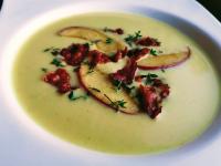 - Bacon in einer Pfanne knusprig anbraten, Apfelspalten zugebem und ca. 2 Minuten mitbraten. Suppe mit der Apfel-Bacon-Mischung anrichten, mit Majoran bestreuen und heiß servieren.