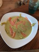 Die Suppe in Teller verteilen, den Lachs in der Mitte drapieren und mit etwas Dill verzieren.