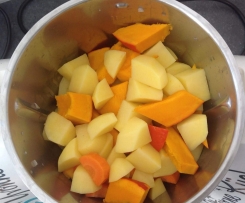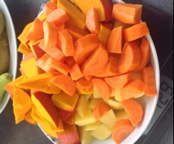 Kürbis waschen (nicht schälen) und in Stücke schneiden. Kartoffeln und Karotten waschen, schälen und in Stücke schneiden.