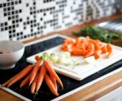 Etwa zwei Hände voll Möhrengrün waschen und dann mit dem Messer fein hacken. Für das Pesto 2 EL Olivenöl, die Walnüsse und das Grün sowie etwas Salz und Pfeffer verrühren.
