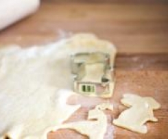 Den Teig rechteckig ausrollen, in Vierecke schneiden. Nach Belieben mit einer Hasenform auch einige Häschen ausstechen. Rechtecke und Häschen mit der Füllung bestreichen.