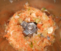 1) Karotte, Knoblauchzehe, Zwiebel und Selleriestange grob schneiden und in den