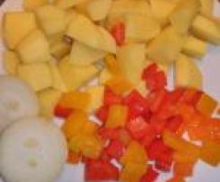 - Kartoffeln und Paprika in Stücke (Größe nach Belieben) schneiden und in den Garaufsatz legen.