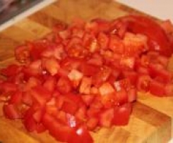 "Sanftrührstufe" Die Zwiebel und Knoblauch andünsten. Mit dem Weißwein ablöschen. Die Tomaten in kleine Würfel schneiden.Die gehackten Tomaten, die gewürfelten Tomaten, die Gemüsebrühe und die Kokosmilch in den