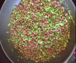 - Speckwürfel in einer Pfanne knusprig anbraten.
