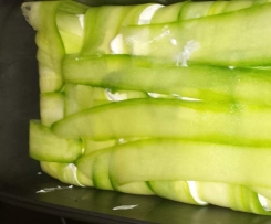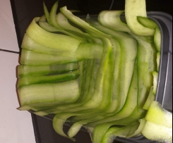 Gurke waschen und schälen. Mit einem Gurkenhobel der Länge nach Scheiben schneiden.
