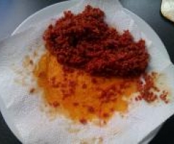Ausgelassene Chorizo auf einem mit Küchenkrepp ausgelegten Teller umfüllen und das überschüssige Fett aufsaugen lassen.