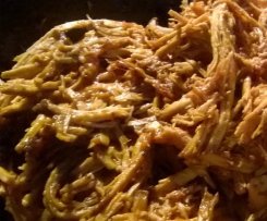 Fleisch aus dem Ofen nehmen. Mit zwei Gabeln das Fleisch in kleine Stücke zupfen und mit BBQ-Sauce vermengen.