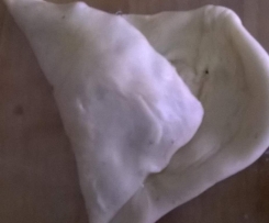 Einen kleinen Tl. Füllung an eine Schmalseite setzen und dann über der Füllung zum Dreieck falten, immer wieder und jeweils zur Längskante hin, so werden nach und nach alle Kanten verschlossen. Man braucht kein Wasser o.ä. zum Verkleben.