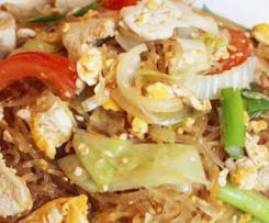 Die Glasnudeln abgießen, auf die Hälfte kürzen in die Pfanne geben, die vorbereitete Soße dazugeben und leicht einköcheön lassen. Fleisch wieder dazugeben und nochmals erhitzen. Mit Salz, Zucker und Pfeffer abschmecken.
