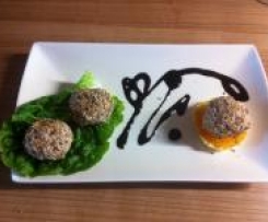 Aus der Masse Kugeln formen. Die Kugeln in Sesam wälzen und vor dem Verzehr ganz leicht anwärmen, entweder Mikrowelle oder Backofen, danach auf Salatblätter legen oder je eine Kugel auf eine geschälte Orangenscheibe setzen. Mit Balsamicocreme verzieren.