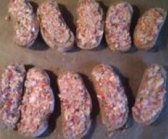 "Mixtopf geschlossen" . 3-5 Sek. / Stufe 6. Die Masse mit Kräutersalz. Pfeffer und Kräutern der Provence würzen. Die Roggenbrötchen längs in 8 baguettegroße Scheiben schneiden. Brotscheiben auf ein mit Backpapier ausgelegtes Backblech legen. Die Masse auf die Brotscheiben geben und mit einer Gabel verteilen und festdrücken.Im vorgeheizten Backofen bei 200 Grad 6-8 Minuten überbacken.