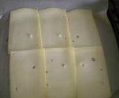 Ein Blech mit Backpapier auslegen und die Käsescheiben übereinander lappend auslegen.Dies im Ofen bei ca 50 - 80 C schmelzen, bis die Ränder verfließen. (Dauert so 5- 10 min)