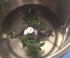 Das Wasser in den Mixtopf geben und die Minzzweige dazu geben.