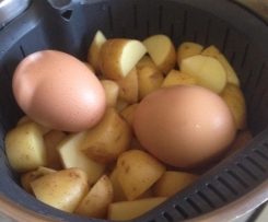 Die Kartoffeln ind mundgerechte Stücke schneiden und mit den rohen Eiern ins Garkörbchen geben.